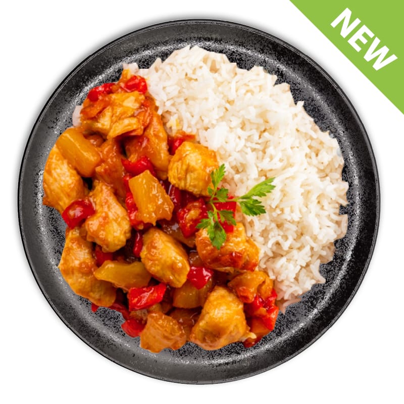 Kip 150g, Paprika 80g, Basmati rijst 170g, Ananas 80g en Zoetzure saus 60g (appelpuree,
